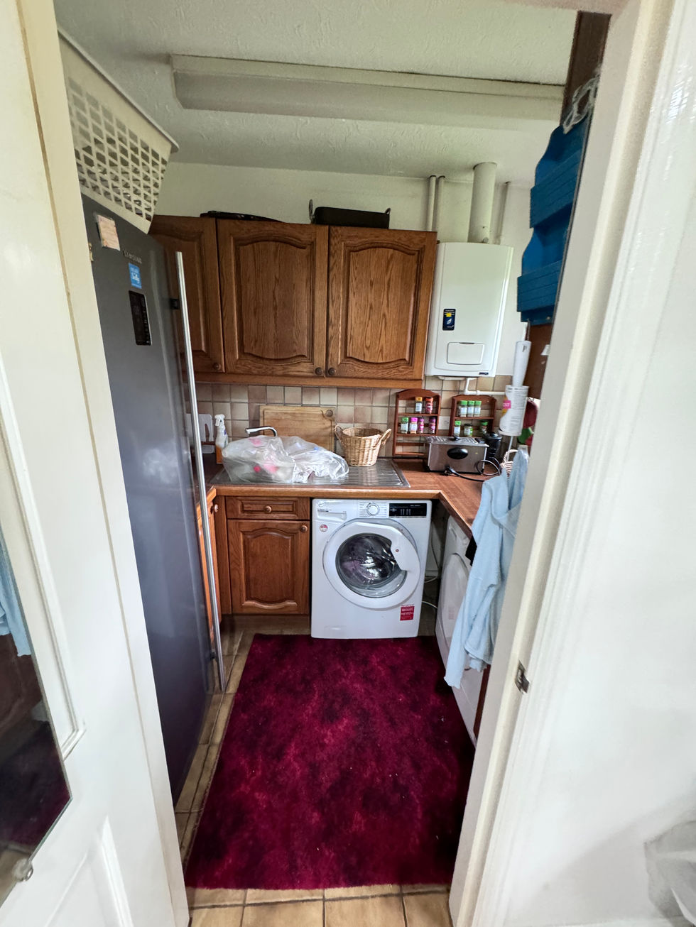 The adjoining utility room has been designed to maximise functionality without compromising on style. Matching shaker cabinetry and black worktops tie the spaces together, while dedicated housing for the washer and dryer, along with ample overhead storage, ensures a neat and efficient layout.