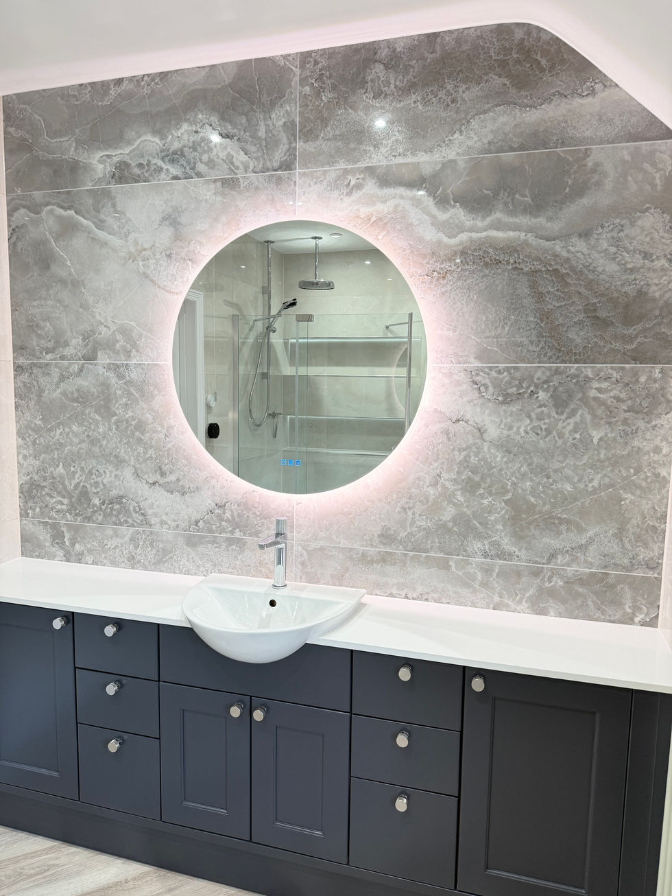• 💡 Backlit Circular Mirror – Provides ambient lighting that reacts perfectly to the natural tones of the room.
