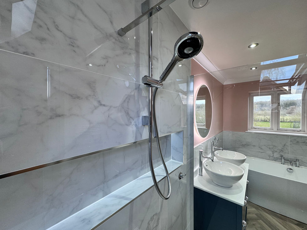 • Walk-in shower with a bespoke recessed LED-lit niche, finished in large format marble-effect tiles for a sleek and timeless look.